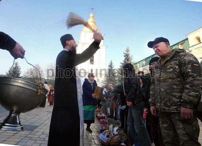 Believers with Easter baskets against the backdrop of destroyed Russian military equipment
