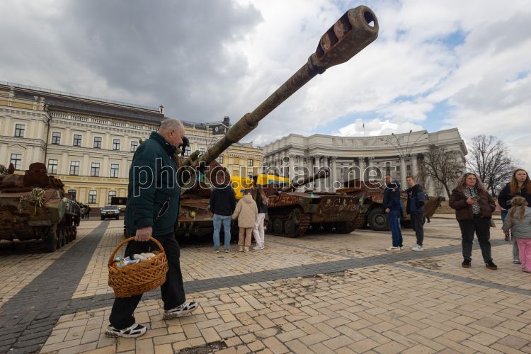 Believers with Easter baskets against the backdrop of destroyed Russian military equipment
