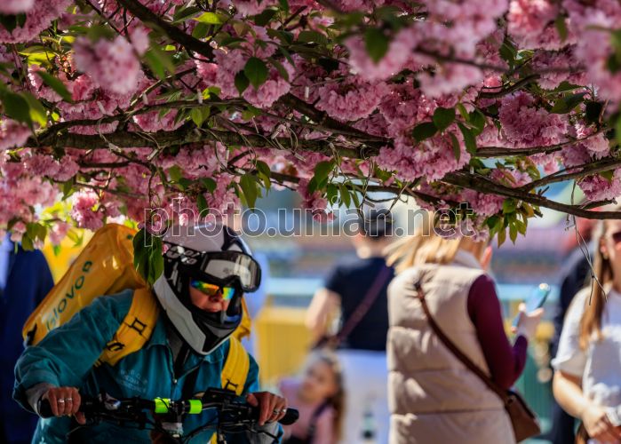 Delivery service courier passes under blooming sakura