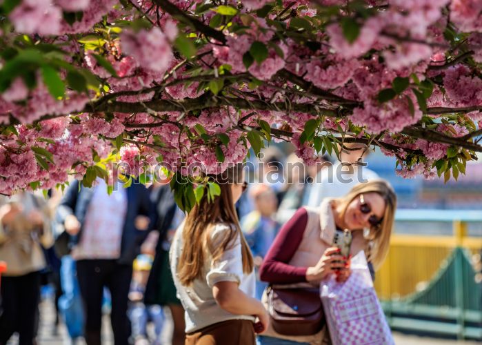 Girls take pictures under blooming sakura