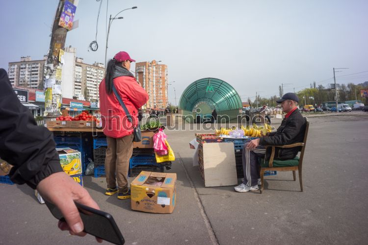 An elderly woman sells bouquets of flowers on the street in the center of Kyiv