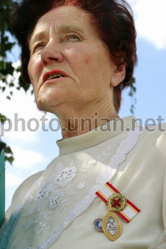 COMM A health visiter of Donetsk Red Cross Valentina Mamzina poses to a photographer with the Florence Nightingale Medal that she was awarded for her help rendered to Chornobyl disaster liquidators in April 1986, Donetsk, Tuesday, September 6, 2005. The Florence Nightingale Medal is the Red Cross Movement's highest international distinction award for the nursing profession. This award was created in 1912 by the 9th International Conference of the Red Cross in honour of Florence Nightingale, an English volunteer nurse . Nurse Nightingale and a group of 40 assistants took care of injured British soldiers at Scutari during the Crimean War (1854-1856). Photo by UNIAN