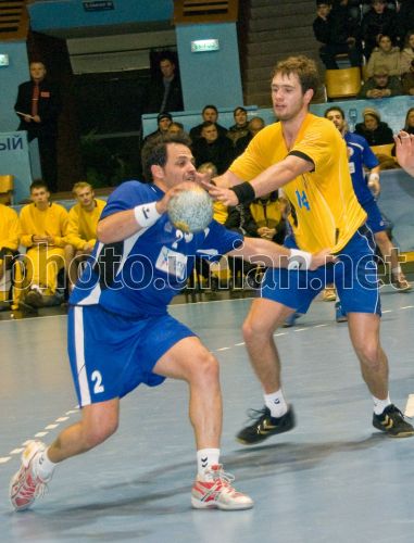 Ukrainian handball player fights for the ball against player of the HC Cyprus during the qualifier handball match in Zaporizhzhya, November 30, 2008. The match ended up with 28-21 to Ukraine. Photo by Aleksandr Prilepa / UNIAN