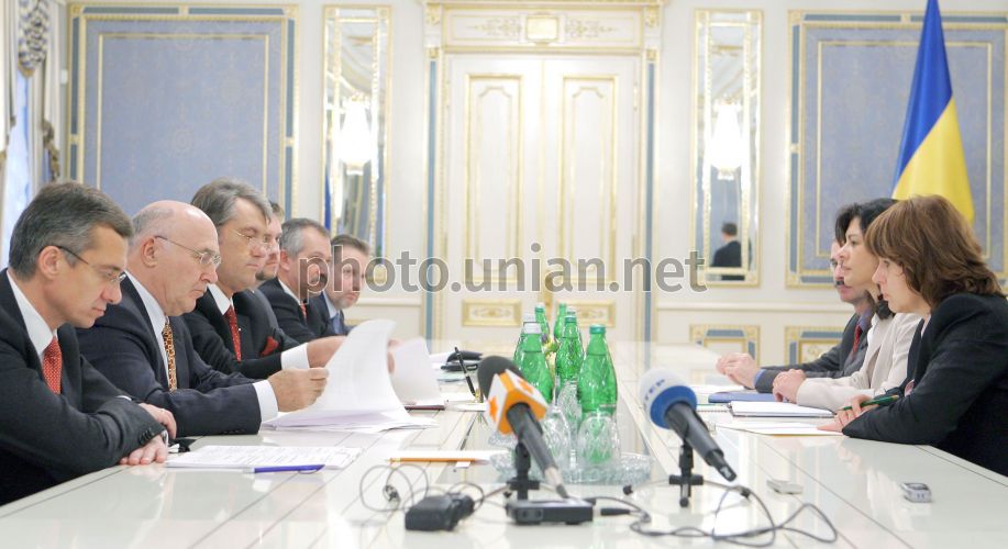 President of Ukraine Viktor Yushchenko, third left, and IMF Head of the Mission in Ukraine Ceyla Pazarbasioglu, second right, in Kyiv, Thursday, December 4, 2008.