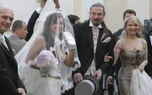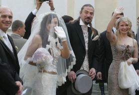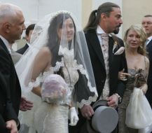 COMM Former Ukrainian Prime Minister Yulia Tymoshenko and the bridegroom of her daughter English rock singer Sean Carr walk to Vedubetsky monastery before the wedding ceremony in Kiev, Sunday, October 2, 2005. Archimandrite Sebastian has carried out the wedding. On Saturday, October 1, 2005, the marriage of Yevgeniya Tymoshenko and Sean Carr was contracted by a civilian registry office in Kiev. Yevgeniya will bear the married name Carr. The wedding is celebrated in Crystal-palace and is closed for strangers. Photo by Viktor Pobedinsky / UNIAN