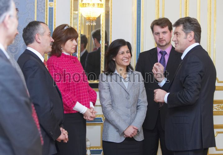 President of Ukraine Victor Yushchenko, right, head of the International Monetary Fund Mission Ceyla Pazarbasioglu, third right and Minister of Finance Viktor Pynzenyk, left, during a meeting with International Monetary Fund Mission in Kiev, December 10, 2008. At the meeting President thanked the IMF for its support of Ukraine in times of world financial crisis. He also assured that the Ukrainian side would keep up to its obligations under the Memorandum on economic and financial policy. Beside that President addressed the IMF with a request to consider supporting of some additional measures, such as financing of projects within the framework of preparation to EURO 2012 or construction of housing. Photo by Markiv Mikhail / POOL / UNIAN