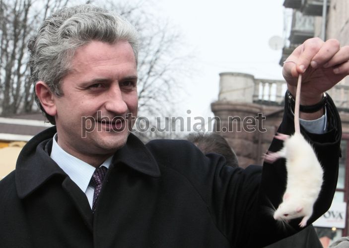 A passer-by holds a rat