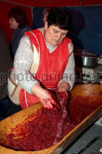 A woman preparing black pudding during the Butchers Festival in Gecha village (the Beregivskiy region, the Zakarpattya Oblast) on Saturday, January 31, 2009. 6 teams: 4 teams from the Zakarpattya and 2 teams from Hungary took part in the Festival this day. During the festival, the butchers teams showed to guests the national tradition of slicing pigs and cooking it with a help of straw and fire, they also cooked Hungarian national dishes. Photo by Nemesh Yanosh/ UNIAN
