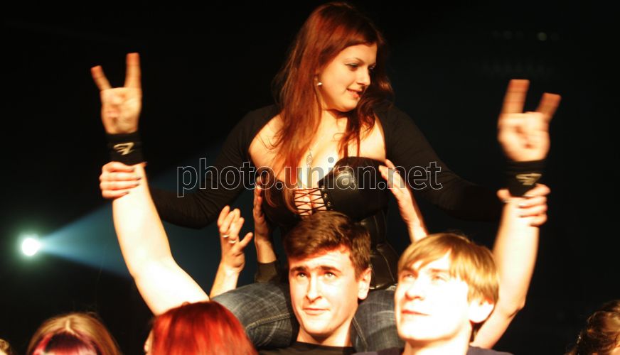 A girl wearing a hoop with deer antlers crosses the street in Kyiv