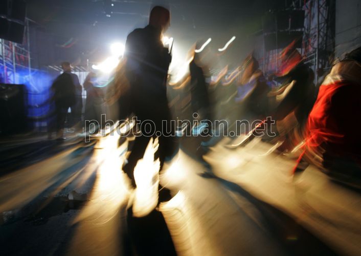A girl wearing a hoop with deer antlers crosses the street in Kyiv