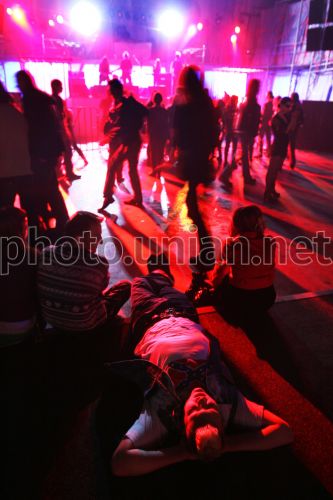 A girl wearing a hoop with deer antlers crosses the street in Kyiv