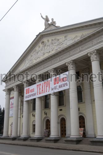Sculpture of the ancient Greek god of healing Asclepius at the entrance to the Family Pharmacy in Chernivtsi