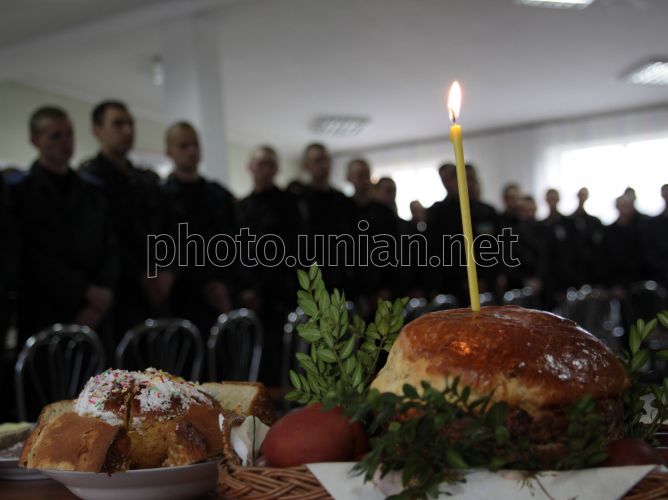 The father Nikolay holds an icon lamp with the Beneficial fire