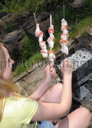 Men are grilling kebabs on a grill near Sonyachne Lake in Kyiv