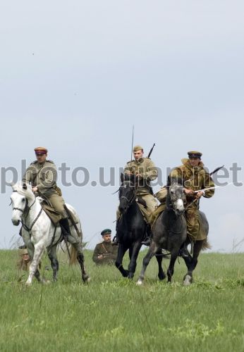 Participants of "Kyiv Club "Red Star" youth public organization riding on horses in a uniform of the Soviet soldiers during a reconstruction of the fight within the frameworks of the 5th International Military-Historical festival "Great Victory. May of 1945" dedicated to the 64th anniversary of Victory in the Great Patriotic war, in Kyiv, on Monday, May 11, 2009. Photo by Viktor Kushchenko/UNIAN