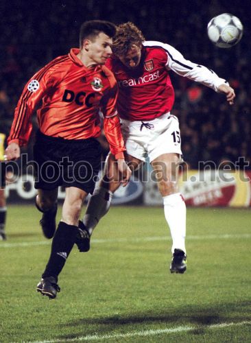 Donetsk's Shakhtar's captain Sergey Popov, left, returns a ball by his head during the UEFA Champions' League match -- Shakhtar vs. Arsenal in Donetsk, November 7, 2000. Shakhtar won the game with the score of 3:0, personally occupied the third place in the group, and now will continue the fight in the UEFA Cup.