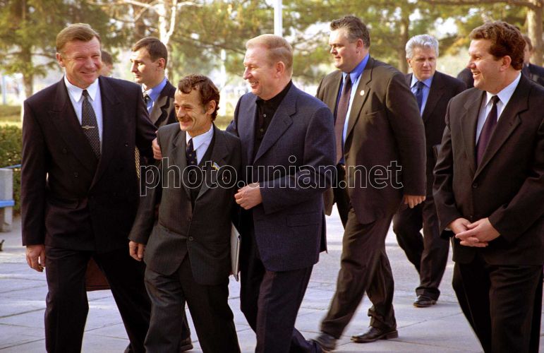 Ukrainian President Leonid Kuchma, center, and Crimean Tatars People's Committee Chairman under the President of Ukraine Mustafa Dzhemilev, (second, left), accompanied by the Crimean Cabinet of Ministers Chairman Sergey Kunitsyn (first, right), Head of Presidential Administration Vladimir Litvin (second, right) and others enter the Bakhchisarai Mayor's Office on Friday, November 10, 2000. On the same day Mr. Kuchma, accompanied by 12 members of the Ukrainian Cabinet of Ministers arrived in the Crimea with the one-day visit. The President carried out the two-hour sitting of the Crimean Tatars People's Committee in August of 1999. Besides, the most part of aspects of return and settlement of the deported people are successfully decided. The two questions, which are the most important for Crimean Tatars, are still out of the frame of the meeting - the recognition of the Crimean Tatars as the aboriginal population of the Crimea and the allotting areas for Crimean Tatars.
