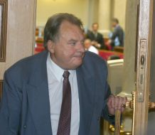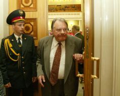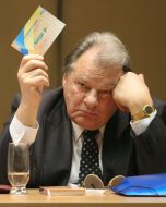 National Rukh of Ukraine Leader Gennadyi Udovenko stands at the fence around the territory, where earlier the tents of the participants of the action "Ukraine without Kuchma" were placed, and now the building works are carried out, on which he has just attached a leaflet with the requirement "prisons for bandits" in Kyiv center on Tuesday, February 13, 2001. On the very same day the National Rukh of Ukraine , Party "Reforms and Order" and Congress of Ukrainian Nationalists carried out the joint action "Ukraine for truth", aimed to attract the attention of NRU, PRO and CUN adherents to the investigation of Vyacheslav Chornovil's death and case of missing Georgyi Gongadze. They also required the retirement of ministers of powered structures.