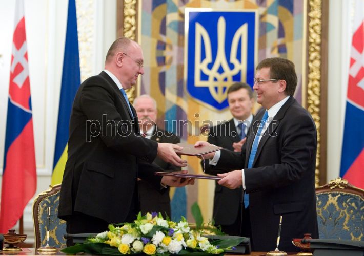 Minister of foreign affairs of Ukraine Konstantin Grischenko, right, and secretary of the state of Slovakia Milan of Ezhevitsa during the ceremony of signing of bilateral documents about abolition of consulage, in Kiev, on Wednesday, October 6, 2010. President of Ukraine Viktor Yanukovych and President of the Republic of Slovakia Ivan Gašparovič held a tête-a-tête meeting in Kyiv. Welcoming his Slovak colleague in Kyiv, Viktor Yanukovych thanked him for accepting an invitation to visit Ukraine that the Head of state made during a telephone conversation in March.“Your visit signals about strengthening of our good neighborly relations. I am convinced that we share a desire to foster our interstate affairs,” the President of Ukraine said. The Head of state noted that Ukraine and Slovakia have a good record of relations, which is the basis for their further enhancement. On his part, the President of the Republic of Slovakia underlined that he was pleased to receive from his Ukrainian colleague an invitation to visit Ukraine. “Our genetics are kindred, our Slavic roots are common. The Ukrainian and Slovak languages are congenial, the same is about our culture. All this determines cooperation between our countries,” I. Gašparovič said about traditionally friendly relations between Ukraine and Slovakia. He pointed out that Slovakia watches closely the events in Ukraine and is glad for its success: “If Ukraine has a success, we are rejoicing at it. I guess you think the same.” In the President of Slovakia’s opinion, there is an immense capacity for expanding ties between our countries, holding a dialogue and developing cooperation. Photo by Mikhail Markiv / POOL / UNIAN
