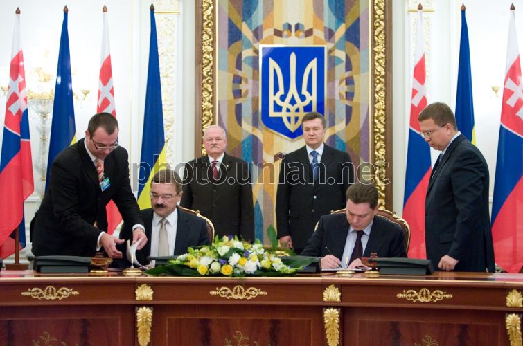 Minister of transport and communications Konstantin Efimenko, second from the righr, and ambassador of Slovakia in Ukraine Paul Ganzhik during the ceremony of signing of amendment in the intergovernmental agreement about the air connection, in Kiev, on Wednesday, October 6, 2010. President of Ukraine Viktor Yanukovych and President of the Republic of Slovakia Ivan Gašparovič held a tête-a-tête meeting in Kyiv. Welcoming his Slovak colleague in Kyiv, Viktor Yanukovych thanked him for accepting an invitation to visit Ukraine that the Head of state made during a telephone conversation in March.“Your visit signals about strengthening of our good neighborly relations. I am convinced that we share a desire to foster our interstate affairs,” the President of Ukraine said. The Head of state noted that Ukraine and Slovakia have a good record of relations, which is the basis for their further enhancement. On his part, the President of the Republic of Slovakia underlined that he was pleased to receive from his Ukrainian colleague an invitation to visit Ukraine. “Our genetics are kindred, our Slavic roots are common. The Ukrainian and Slovak languages are congenial, the same is about our culture. All this determines cooperation between our countries,” I. Gašparovič said about traditionally friendly relations between Ukraine and Slovakia. He pointed out that Slovakia watches closely the events in Ukraine and is glad for its success: “If Ukraine has a success, we are rejoicing at it. I guess you think the same.” In the President of Slovakia’s opinion, there is an immense capacity for expanding ties between our countries, holding a dialogue and developing cooperation. Photo by Mikhail Markiv / POOL / UNIAN