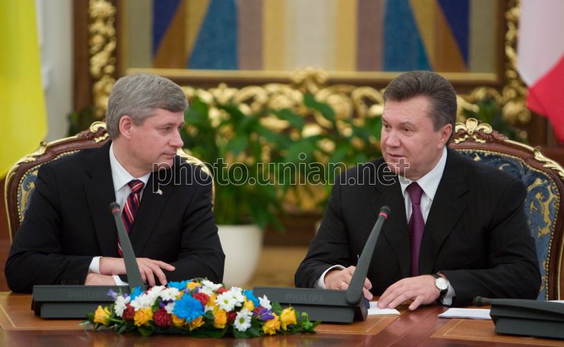 President of Ukraine Viktor Yanukovih, right, and Prime Minister of Canada Stephen Harper during press-conference in Kiev, on Monday, October 25, 2010. In the presence of President Viktor Yanukovych and Prime Minister of Canada Stephen Harper the intergovernmental Memorandum of understanding on youth exchange programs was signed in Kyiv. The document was signed by Minister of Ukraine for Family, Youth and Sports and Ambassador Extraordinary and Plenipotentiary of Canada to Ukraine. The main purpose of the Memorandum is to provide young people of the two countries with additional opportunities to travel, live and work in Ukraine and Canada. Photo by Mikhail Markiv / POOL / UNIAN