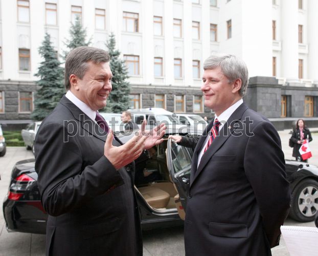 President of Ukraine Viktor Yanukovih, left, and Prime Minister of Canada Stephen Harper after the press-conference in Kiev, on Monday, October 25, 2010. In the presence of President Viktor Yanukovych and Prime Minister of Canada Stephen Harper the intergovernmental Memorandum of understanding on youth exchange programs was signed in Kyiv. The document was signed by Minister of Ukraine for Family, Youth and Sports and Ambassador Extraordinary and Plenipotentiary of Canada to Ukraine. The main purpose of the Memorandum is to provide young people of the two countries with additional opportunities to travel, live and work in Ukraine and Canada. Photo by Andrey Mosienko / POOL / UNIAN