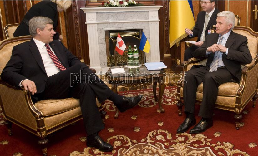 Chairman of the Verkhovna Rada of Ukraine Vladimir Litvin, right, and Prime Minister of Canada Stephen Harper during meeting in Kiev, on Monday, October 25, 2010.Vladimir Litvin highly appreciated the level of the political dialogue between Ukraine and Canada. The Head of the Parliament emphasised that the Prime Minister was not only the Chairman of the Government of the state that had special partner relations with Ukraine, but also his colleague to deal with the parliamentary matters. Vladimir Litvin also called for strengthening the interparliamentary part of the bilateral relations on all the levels, and appreciated the visit of Peter Milliken, Speaker of the House of Commons, to Ukraine last year. The Chairman of the Ukrainian Parliament also named the Ukrainian-Canadian Parliamentary Program as a unique one lasting for 19 years and giving an opportunity for the young generation to work in the offices of the parliamentarians and participate in the organizational work of democratic institutions. The Head of the Parliament mentioned active participation of the Ukrainian community in the political life of Canada. Vladimir Litvin called for boosting bilateral cooperation in the cultural and humanitarian sectors. At the request of the Canadian Prime Minister, Vladimir Litvin briefed on the political situation in Ukraine, in particular, the progress of the election campaign in the regions. Photo by Anastasiya Sirotkina / POOL / UNIAN