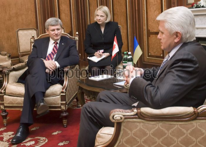 Chairman of the Verkhovna Rada of Ukraine Vladimir Litvin, right, and Prime Minister of Canada Stephen Harper during meeting in Kiev, on Monday, October 25, 2010.Vladimir Litvin highly appreciated the level of the political dialogue between Ukraine and Canada. The Head of the Parliament emphasised that the Prime Minister was not only the Chairman of the Government of the state that had special partner relations with Ukraine, but also his colleague to deal with the parliamentary matters. Vladimir Litvin also called for strengthening the interparliamentary part of the bilateral relations on all the levels, and appreciated the visit of Peter Milliken, Speaker of the House of Commons, to Ukraine last year. The Chairman of the Ukrainian Parliament also named the Ukrainian-Canadian Parliamentary Program as a unique one lasting for 19 years and giving an opportunity for the young generation to work in the offices of the parliamentarians and participate in the organizational work of democratic institutions. The Head of the Parliament mentioned active participation of the Ukrainian community in the political life of Canada. Vladimir Litvin called for boosting bilateral cooperation in the cultural and humanitarian sectors. At the request of the Canadian Prime Minister, Vladimir Litvin briefed on the political situation in Ukraine, in particular, the progress of the election campaign in the regions. Photo by Anastasiya Sirotkina / POOL / UNIAN