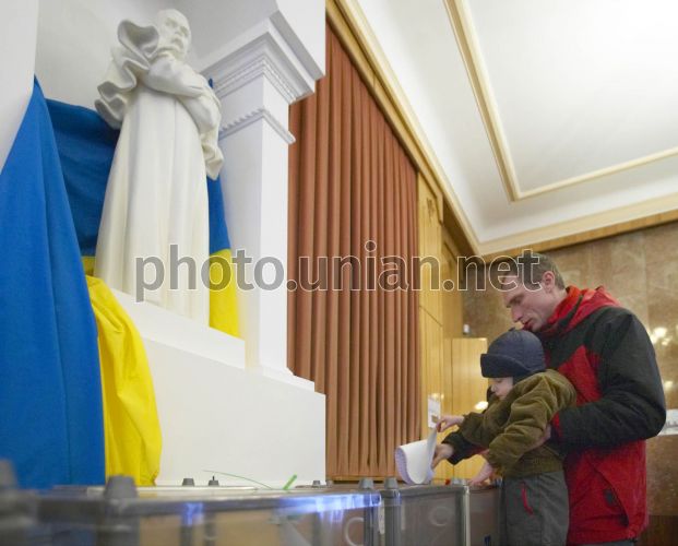 COMM Ukrainian citizen with a child drops his ballot into a ballot-box during the voting at an electoral district in Moscow, Russia, Sunday, March 26, 2006. This day Ukraine votes in the Parliamentary election, seen as the first electoral test for President Viktor Yushchenko's liberal team. Photo by UNIAN