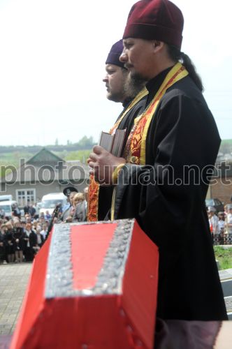 Priests near the biers with six soviet soldiers during reburial ceremony in Stariy Merchik village of Kharkov region, May 5, 2011. This day in Stariy Merchik village reburial ceremony of six soldiers took place: Trofim Kartashov, Aleksey Glazunov, Vasiliy Martynyuk, Nikolay Babaykan, Vasiliy Smirnov and Konstantin Smirnov, died at the beginning of September 1943. Photo by Vladimir Andreev / UNIAN