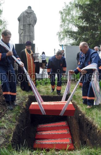 Participants of the funeral meeting drop down the bier with the remains of the soviet soldiers into the bed of honour during reburial ceremony in Stariy Merchik village of Kharkov region, May 5, 2011. This day in Stariy Merchik village reburial ceremony of six soldiers took place: Trofim Kartashov, Aleksey Glazunov, Vasiliy Martynyuk, Nikolay Babaykan, Vasiliy Smirnov and Konstantin Smirnov, died at the beginning of September 1943. Photo by Vladimir Andreev / UNIAN