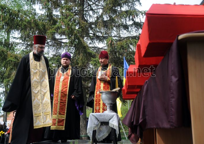 Priests near the biers with six soviet soldiers during reburial ceremony in Stariy Merchik village of Kharkov region, May 5, 2011. This day in Stariy Merchik village reburial ceremony of six soldiers took place: Trofim Kartashov, Aleksey Glazunov, Vasiliy Martynyuk, Nikolay Babaykan, Vasiliy Smirnov and Konstantin Smirnov, died at the beginning of September 1943. Photo by Vladimir Andreev / UNIAN