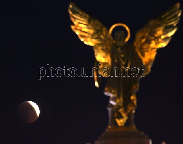 A sculpture of protector of Kiev archangel Mikhail on the back of total lunar eclipse, in Kiev, on the night of Thursday, June 16, 2011. Yesterday night Ukrainians had an opportunity to observe a total lunar eclipse. It was a relatively rare central eclipse, visible over Europe and South America after sunset, over Africa and most of Asia, and Australia before sunrise. In Ukraine, the eclipse started at 10.22 p.m., reaching the greatest eclipse point at 11.15 p.m. This was not the last lunar eclipse in 2011, the second expected on December 10. The next central total lunar eclipse will be on July 27, 2018. Photo by Andrey Skakodub / UNIAN