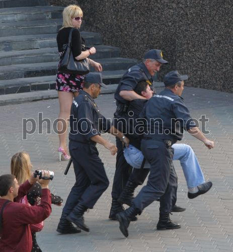 Miitia employees detain the participants of the protest action "revolution in social network" in Minsk (Belorussia), on Wednesday, June 22, 2011. This day in the dozens of towns of Belorussia the action of "silent solidarity” took place. The participants tried to protest without slogans and in a peaceful manner against the government. About 450 people were detained. Most of the detainees - more than 200 people – were in Minsk, the rest - in the regions. In the capital of Belarussia several journalists have been detained. Photo by Sergey Kostin / UNIAN