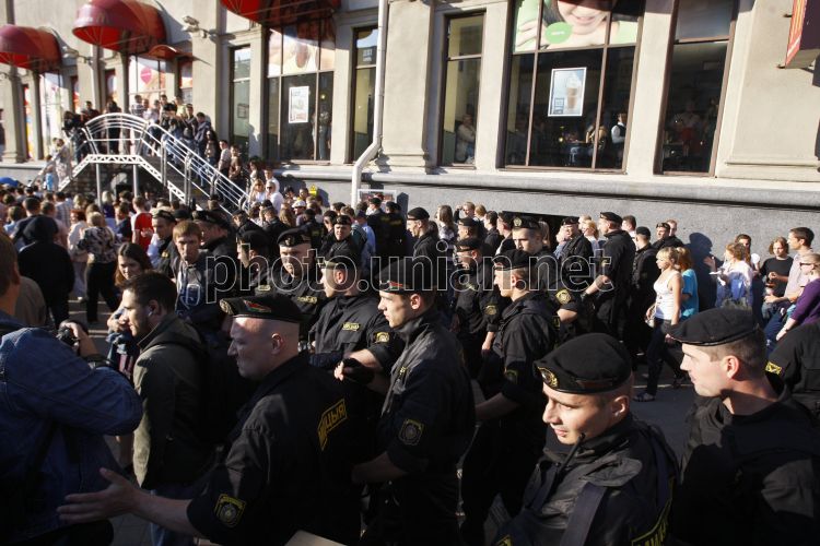 Miitia employees suppress the protest action "revolution in social network" in Minsk (Belorussia), on Wednesday, June 22, 2011. This day in the dozens of towns of Belorussia the action of "silent solidarity” took place. The participants tried to protest without slogans and in a peaceful manner against the government. About 450 people were detained. Most of the detainees - more than 200 people – were in Minsk, the rest - in the regions. In the capital of Belarussia several journalists have been detained. Photo by Sergey Kostin / UNIAN