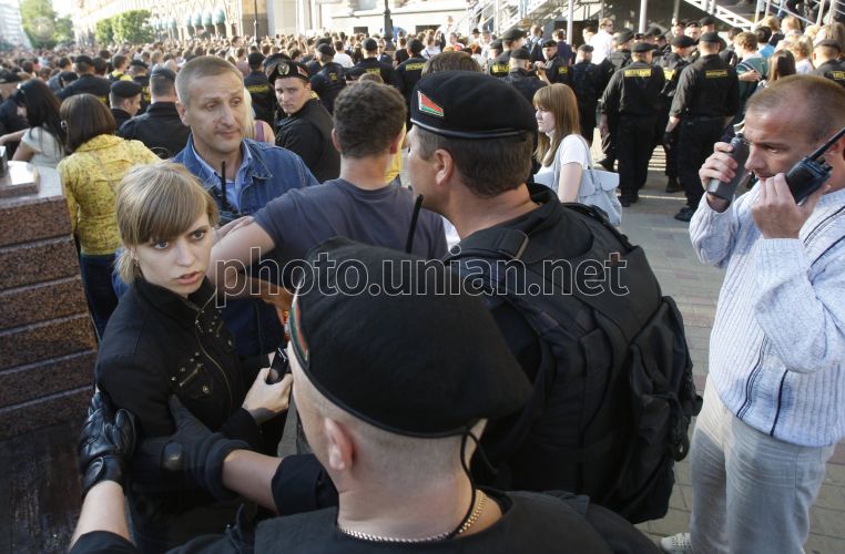Miitia employees suppress the protest action "revolution in social network" in Minsk (Belorussia), on Wednesday, June 22, 2011. This day in the dozens of towns of Belorussia the action of "silent solidarity” took place. The participants tried to protest without slogans and in a peaceful manner against the government. About 450 people were detained. Most of the detainees - more than 200 people – were in Minsk, the rest - in the regions. In the capital of Belarussia several journalists have been detained. Photo by Sergey Kostin / UNIAN