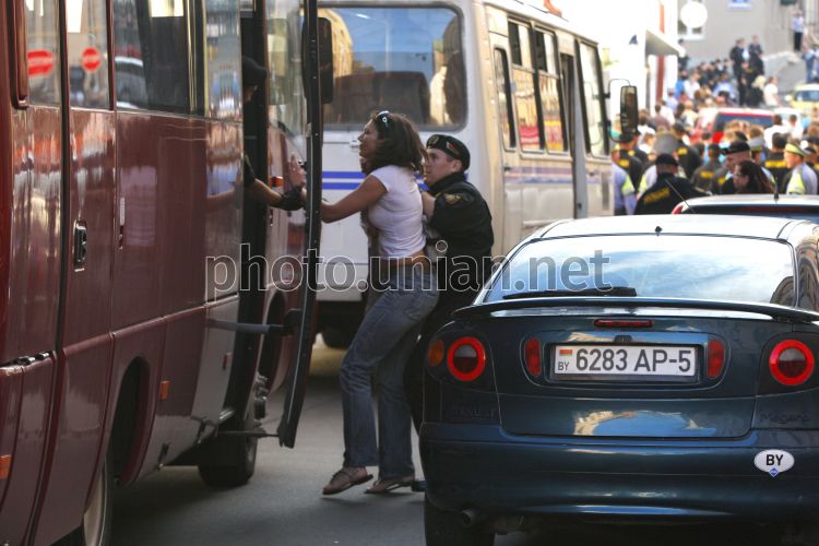 Miitia employees detain the participants of the protest action "revolution in social network" in Minsk (Belorussia), on Wednesday, June 22, 2011. This day in the dozens of towns of Belorussia the action of "silent solidarity” took place. The participants tried to protest without slogans and in a peaceful manner against the government. About 450 people were detained. Most of the detainees - more than 200 people – were in Minsk, the rest - in the regions. In the capital of Belarussia several journalists have been detained. Photo by Sergey Kostin / UNIAN