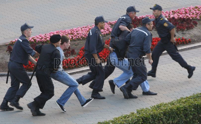 Miitia employees detain the participants of the protest action "revolution in social network" in Minsk (Belorussia), on Wednesday, June 22, 2011. This day in the dozens of towns of Belorussia the action of "silent solidarity” took place. The participants tried to protest without slogans and in a peaceful manner against the government. About 450 people were detained. Most of the detainees - more than 200 people – were in Minsk, the rest - in the regions. In the capital of Belarussia several journalists have been detained. Photo by Sergey Kostin / UNIAN