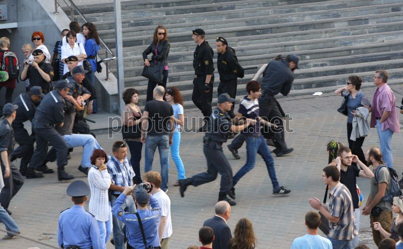Miitia employees detain the participants of the protest action "revolution in social network" in Minsk (Belorussia), on Wednesday, June 22, 2011. This day in the dozens of towns of Belorussia the action of "silent solidarity” took place. The participants tried to protest without slogans and in a peaceful manner against the government. About 450 people were detained. Most of the detainees - more than 200 people – were in Minsk, the rest - in the regions. In the capital of Belarussia several journalists have been detained. Photo by Sergey Kostin / UNIAN