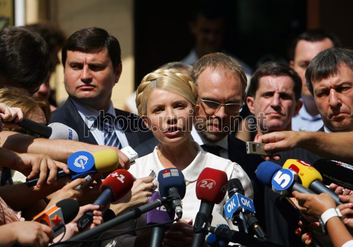 Batkivshchyna Party leader and former Prime Minister of Ukraine Yulia Timoshenko and her defender Sergey Vlasenko answers the questions of the journalists during a break in a sitting of Pechersk District Court in Kiev, on Monday, July 18, 2011. The court decided to remove Vlasenko from the courtroom until the end of the judicial process on the gas supply case opened against Timoshenko. Photo by Andrey Skakodub / UNIAN