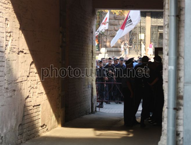 Militia employees near the building of Pechersk District Court in Kiev, on Monday, July 18, 2011. The court decided to remove Vlasenko from the courtroom until the end of the judicial process on the gas supply case opened against Timoshenko. Photo by Aleksandr Prokopenko / POOL / UNIAN