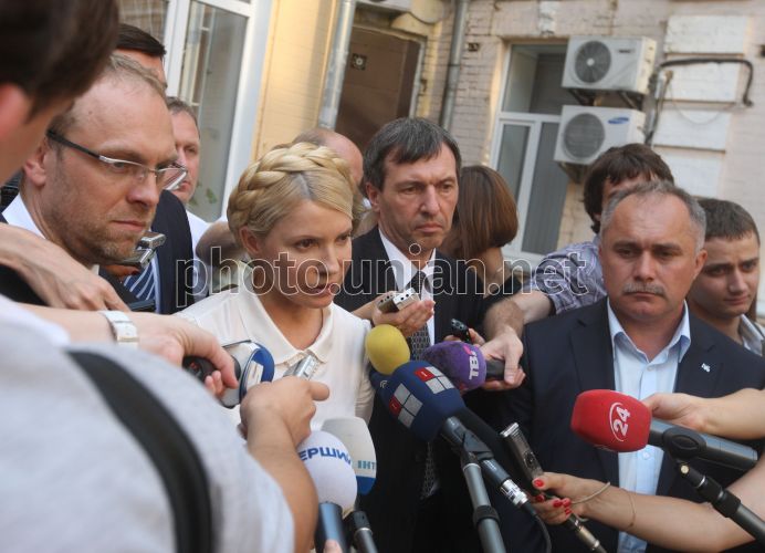 Batkivshchyna Party leader and former Prime Minister of Ukraine Yulia Timoshenko and her defenders, from left to right: Sergey Vlasenko, Nikolay Siryi and Aleksandr Plakhotnyuk answer the questions of the journalists during a break in a sitting of Pechersk District Court in Kiev, on Monday, July 18, 2011. The court decided to remove Vlasenko from the courtroom until the end of the judicial process on the gas supply case opened against Timoshenko. Photo by Aleksandr Prokopenko / POOL / UNIAN