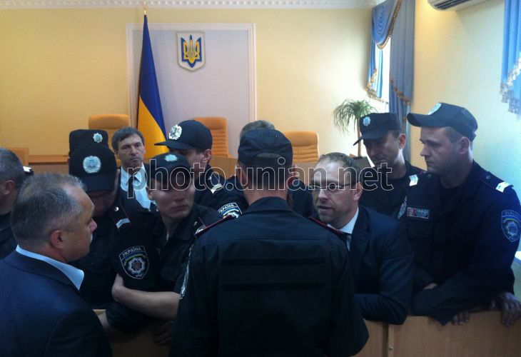 Juridical police blocks the defense lawyers of the former Prime Minister of Ukraine Yulia Timoshenko Sergey Vlasenko, 2nd from the right, and Aleksandr Plakhotnyuk, left, in the hall of the Pechersk District Court, in Kiev, on Monday, July 18, 2011. According Yulia Tymoshenko’s lawyer Nikolay Siryi, they were wrongly removed from participation in the trial and denied the opportunity to provide comprehensive legal assistance to Yulia Timoshenko in court, as "pubic pressure" on the defense. Photo made by mobile phone / UNIAN
