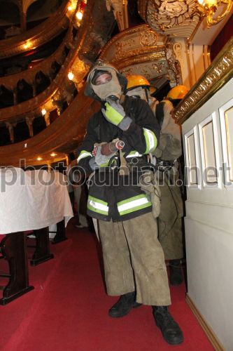 MES employees during fire and tactical exercises on extinguishing fires in the building of the Odessa National Academic Theater of Opera and Ballet, in Odessa, on Tuesday, July 19, 2011. This day, Emergency Situations Ministry conducted a routine tactical exercises on extinguishing the fire at the Odessa National Academic Theater of Opera and ballet.