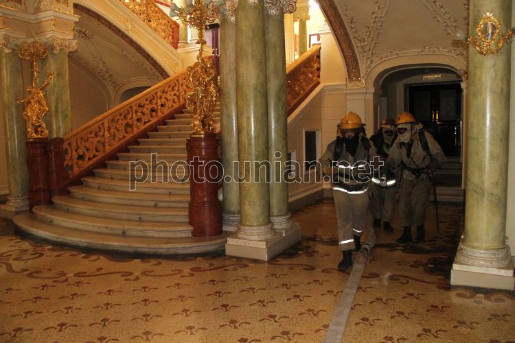 MES employees during fire and tactical exercises on extinguishing fires in the building of the Odessa National Academic Theater of Opera and Ballet, in Odessa, on Tuesday, July 19, 2011. This day, Emergency Situations Ministry conducted a routine tactical exercises on extinguishing the fire at the Odessa National Academic Theater of Opera and ballet. Photo by Maksim Skripka / UNIAN