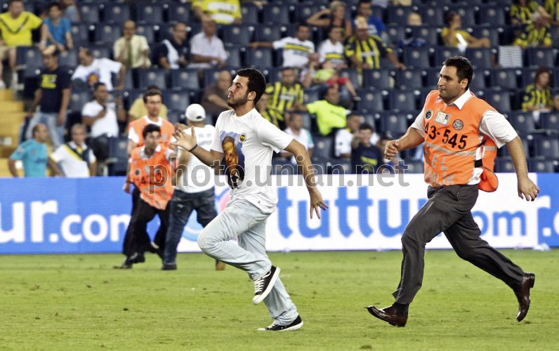 Steward of a stadium runs for a Turkish fan in a T-shirt with the president of "Fenerbahce" Aziz Yildirim, which the court has accused on the organization of fixed games, during a friendly soccer match between FC "Fenerbahce" (Istanbul, Turkey) and FC "Shakhtar" (Donetsk, Ukraine), in Istanbul (Turkey), on Thursday, July 21, 2011. In Istanbul, a friendly match of Donetsk "Shakhtar" with the local "Fenerbahce" was stopped at the 69th minute due to the disorders in the stands and on the field. None of the team failed to score. That is why the final score in this match is 0:0. Photo by Valeriy Belokryl / UNIAN