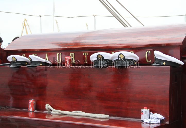 Marine caps on a sailing ship of Navy of Mexico, Cuauhtemoc during arrival in Odessa, on Saturday, July 30, 2011. This day a training ship of Mexico Navy, a sailboat "Cuauhtemoc", came to Odessa. Odessa is one of 16 ports on three continents, that the ship will visit during a training cruise "Mediterranean 2011". Photo by Maksim Skripka / UNIAN