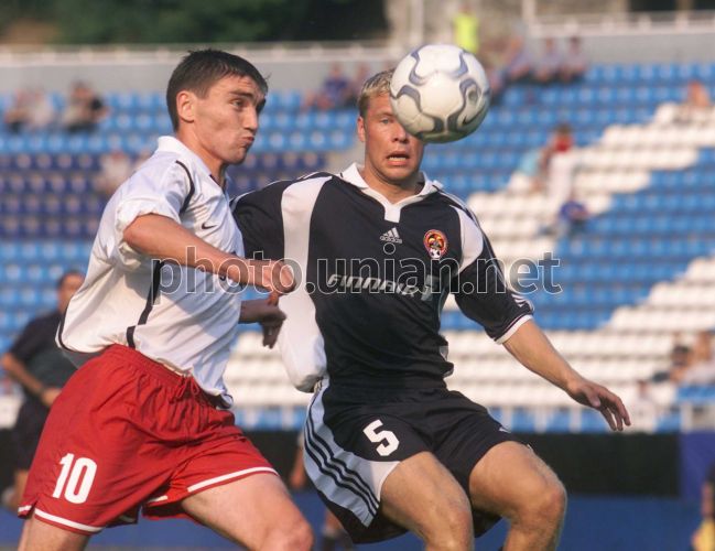 Kyiv Press Photo. The CSKA (Kyiv) player, author of the first goal Ruslan Kostyshyn fights for a ball against the Yokerit’s (Helsinki, Finland) half-back Yanne Moylanen (№5) during the qualifier match of the UEFA Cup in Kyiv on late Thursday, August 9, 2001. CSKA won with the score of 2:0. On August 6 Kyiv’s Mayor Alexander Omelchenko declared that soon Soccer Club CSKA would be passed to Kyiv. Omelchenko informed that he, in details, discussed this matter with the Ukrainian Minister of Defense Alexander Kuzmuk. He also marked that after the passing under the capital’s patronage the Club’s personnel composition will be reconsidered and Kyiv’s Dynamo will acquire worth rival.