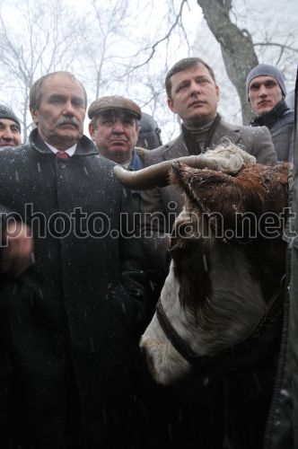 The deputies of Lyashko and Zayats take away the cow from building of parliament during the mass meeting of agrarians