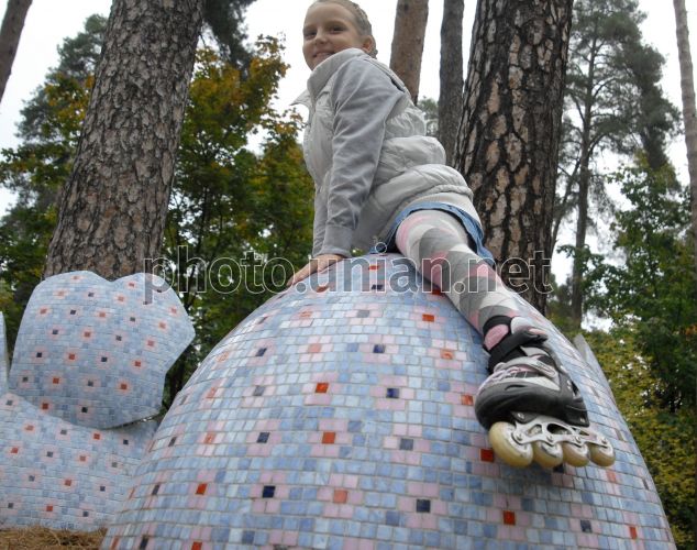 A child sits on a sculpture composition